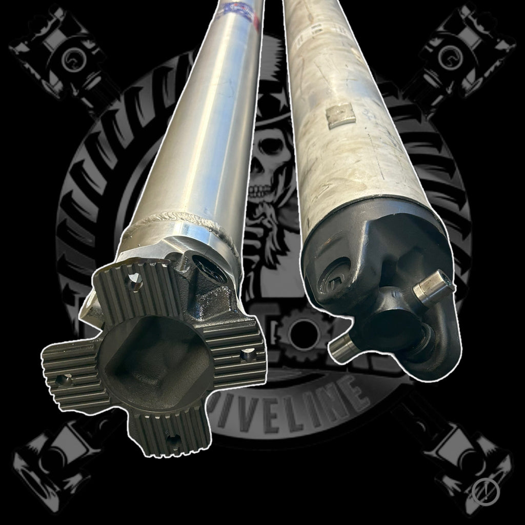 Our Driveshafts are double the wall thickness of the aluminum stock shaft and are offered in 4" outside diameter. Instructions can be sent over to you on how to swap your flange yokes onto this driveshaft once received.