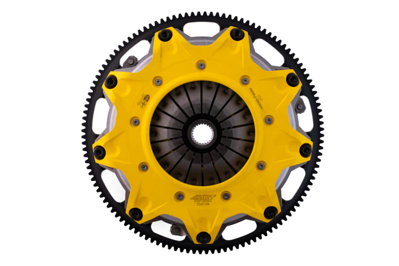 T2SS-N06 Mod-Twin 225 XT Sprung Street Kit is designed for high powered AWD street cars. It unites uncompromised pedal feel, durability, engagement quality with very high torque capacity by combining twice the organic friction surfaces with an ultra-durable spring center Mono-Drive hub in a completely modular design. Each diaphragm spring endures an exclusive four-stage heat treating process providing a consistent light pedal feel. Steel-backed Friction Plates with high quality organic friction materials deliver stable friction coefficient, good heat capacity and long clutch life. These Friction Plates uniformly transfer torque to the Mono-Drive sprung hub assembly which extends input shaft life and reduces driveline shock from torsional vibration. This kit includes a CNC-machined and dynamically balanced flywheel, pressure plate cover, diaphragm spring, face, puck-style ceramic friction plates, sprung Mono-Drive hub assembly, floater, patented Monoloc Collar, release bearing, alignment tool and pilot bearing (if needed). Mod-Twin clutches are fully rebuildable and most components can be ordered separately.