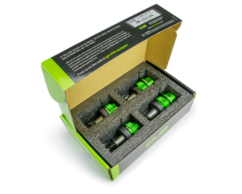 DV8's JKBLJNT-01 is designed for rugged off-road use. DV8 uses SAE4140 chromoly steel studs and SAE1045 steel housings to make one of the toughest ball joints on the market. These ball joints are also greaseable which allows for standard maintenance and increased longevity. The grooves on the side of the housing are closer together resulting in superior resistance to turning that can occur and also helps makes the install easier. Details: SAE4140 and SAE1045 steel, Greaseable, 1-year limited Warranty, For Jeep JK Dana 44, Front and Rear.