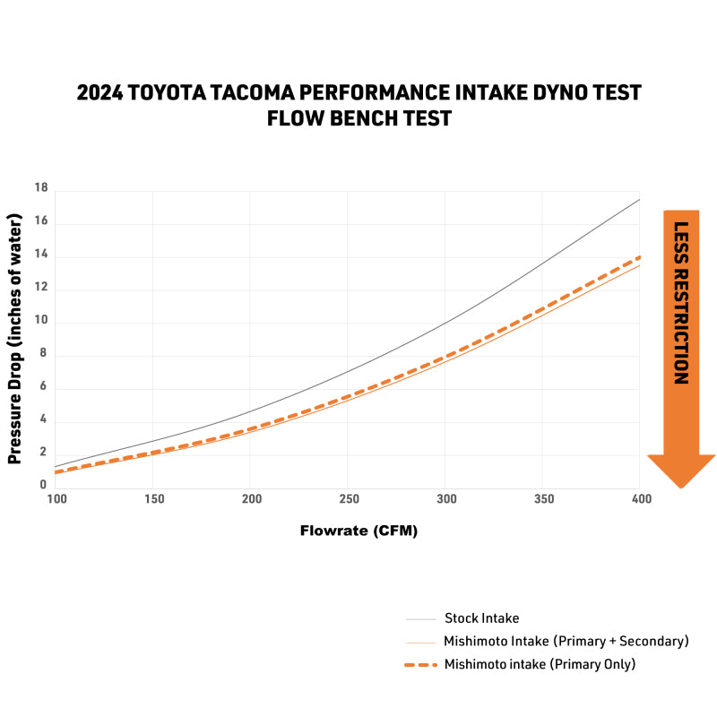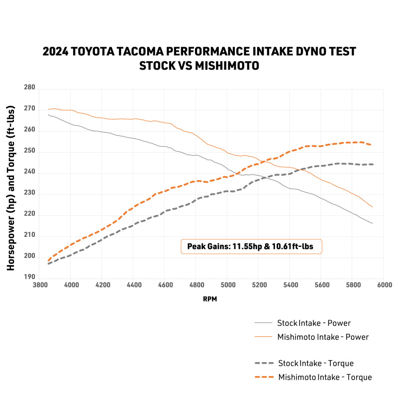 Unlock more power, sound, and style from your 2024+ Toyota Tacoma with the Mishimoto Performance Air Intake. Designed for drivers who want their truck to perform and sound better without compromising reliability, this intake delivers proven performance gains and an aggressive tone that transforms your driving experience.--Dyno testing shows gains of up to 11.6 horsepower and 10.6 ft-lbs of torque, while airflow is improved by 27.7% compared to stock when the plug is removed. The carefully engineered rotomolded airbox keeps intake air temperatures close to stock, ensuring consistent performance even in demanding conditions. Under acceleration, you’ll notice a deeper and more refined intake tone that adds excitement to every drive.--Installation is simple and DIY friendly, making it an ideal weekend upgrade. With a clear written guide and video instructions, most owners can complete the install in under 30 minutes using only basic hand tools. The kit includes everything needed for a secure fit, including a specially designed flexible grommet that allows the system to maintain a proper seal during off-road chassis flex.--Built for rugged reliability, this intake is ready for any environment. The OEM-style MAF housing maintains correct air-fuel ratios to prevent check engine lights, and the high-flow oiled or dry filter options protect your engine from dust and debris on the trail. Safe to run on a stock tune, this system not only enhances sound and performance but also improves the look of your engine bay with a clean, high-quality finish.--Like all Mishimoto products, this Performance Air Intake is backed by the Mishimoto Lifetime Warranty for worry-free performance on and off the road.