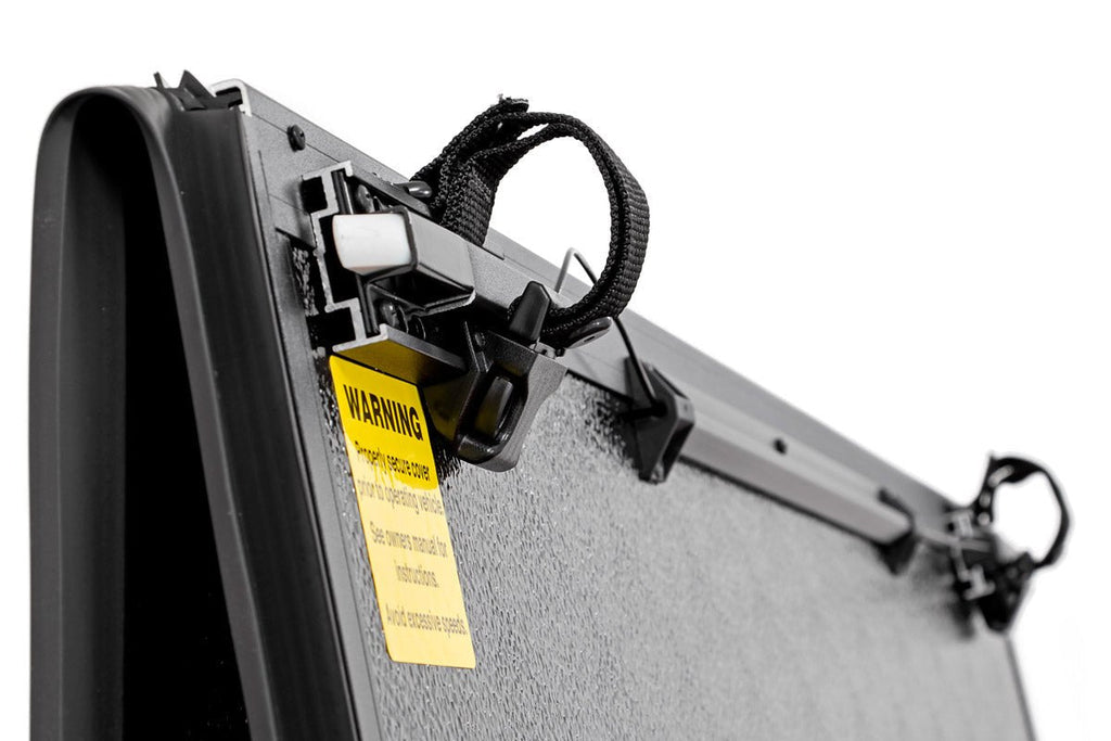 Each cover features a premium, black textured finish for uncompromised protection and killer good looks. The convenient triple-fold design allows you easy access to your bed or the ability to haul large items without entirely removing the cover. Just fold back one or two sections as needed to access the bed, or roll it all the way up and attach the durable storage straps and continue along your way with the cover in the open position. This cover features an easy-open cable latch system that latches in the first and second position, so that there’s no need to walk to the other side of your truck to open the bed cover.